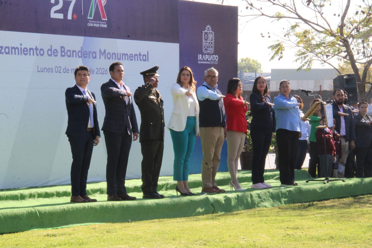 Irapuato, Gto., 2 de marzo de 2026.– Autoridades del Gobierno de Irapuato llevaron a cabo el izamiento de la bandera monumental en la glorieta del bulevar Solidaridad, con el objetivo de dar inicio al mes de marzo y conmemorar sus efemérides más importantes, promoviendo los valores cívicos, el respeto a los símbolos patrios, así como el amor por México y por Irapuato.