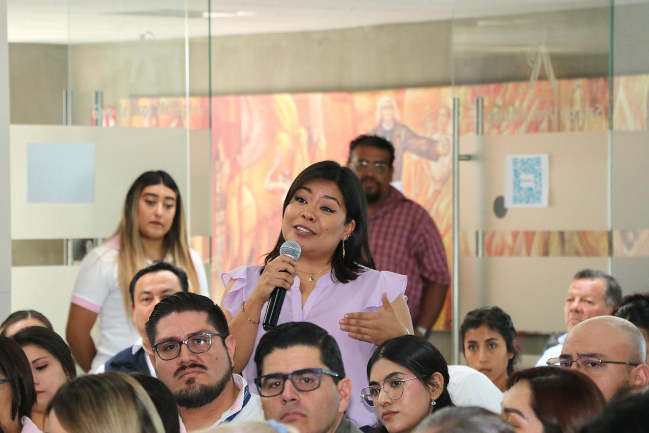 Irapuato, Gto.- a 15 octubre del 2025.- En un nuevo encuentro con trabajadoras y trabajadores municipales de las diferentes direcciones que conforman el Gobierno de Irapuato, la presidenta Lorena Alfaro García destacó los programas y metas alcanzadas durante el primer año de gestión de la Administración 2024-2027, además de escuchar las inquietudes y peticiones de las y los colaboradores.