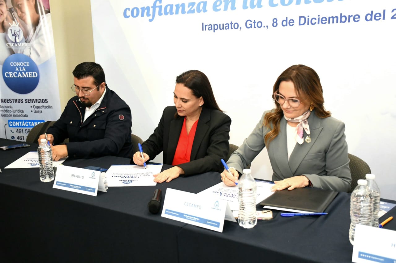 Irapuato, Gto.- a 08 de diciembre del 2025.- Para garantizar que cada irapuatense y guanajuatense reciba una atención médica oportuna y de calidad, autoridades del Gobierno de Irapuato firmaron un convenio con la Comisión Estatal de Conciliación y Arbitraje Médico (Cecamed), que permitirá asesorar a la ciudadanía y coadyuvar en la resolución de controversias que pudieran presentarse en los centros de atención médica.